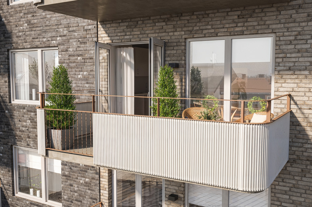 Närheten till utemiljön är central. Lägenheter i bottenplan har terrasser, medan övriga bostäder har balkong – några har även två.